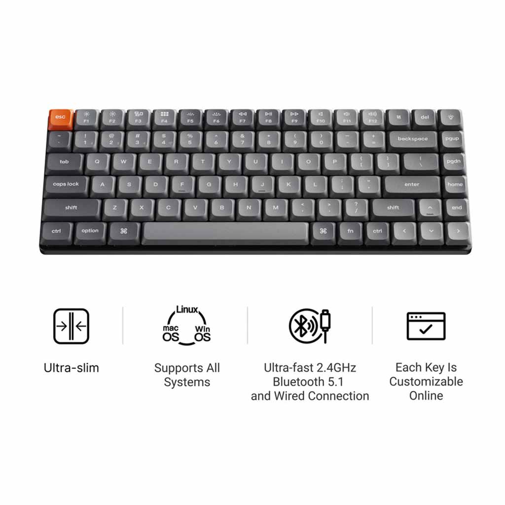 Keychron K3 Max is an ultra-slim wireless custom mechanical keyboard. It supports 2.4 GHz, Bluetooth, and a wired connection. It allows anyone to master any keys or macro commands on its 75% compact layout through Keychron Launcher web app. Besides, it has included LSA (low profile spherical-angled) profile keycaps for both Windows and macOS, and users can hot-swap with Gateron low-profile MX mechanical switch in a breeze (for RGB Backlight Hot-Swappable Version only).